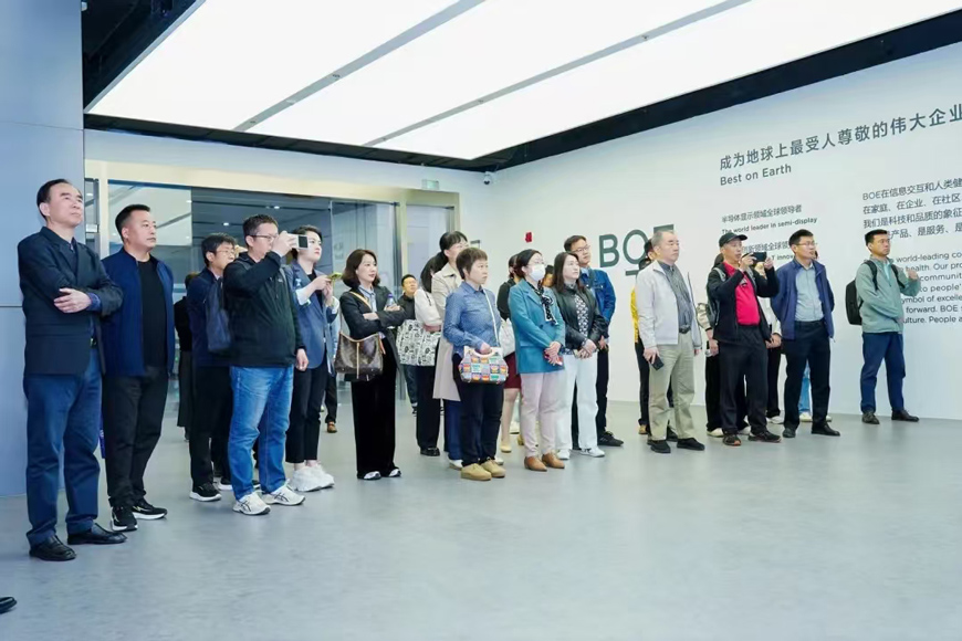 △與會代表參觀走訪京東方實地考察柔性屏幕智能生產(chǎn)線應(yīng)用場景。